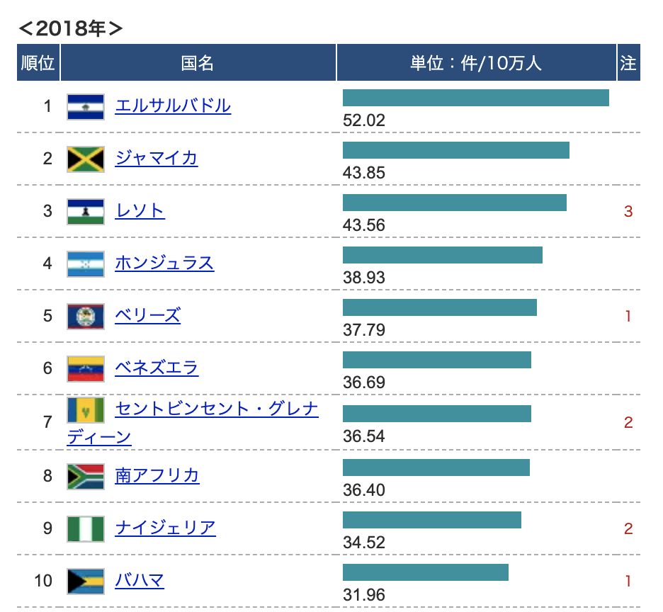 以下、同じランキングを参考にG8各国を並べてみました。確かに日本は人口(10万人)あたりの殺人発生率が低いことがわかります。