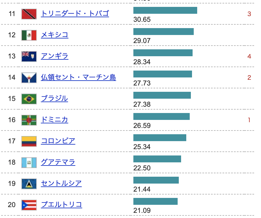 1-20位までを整理してみましたがアフリカ、中米、南米の国が入ってきています。