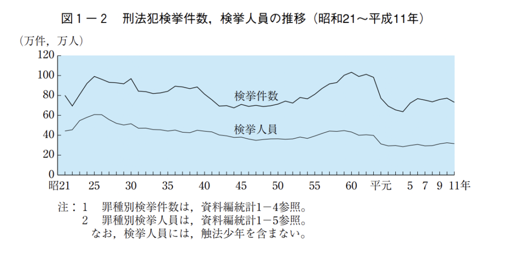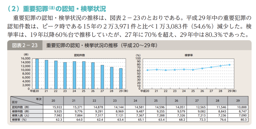 日本の検挙率は、法務省の『犯罪白書』によると、